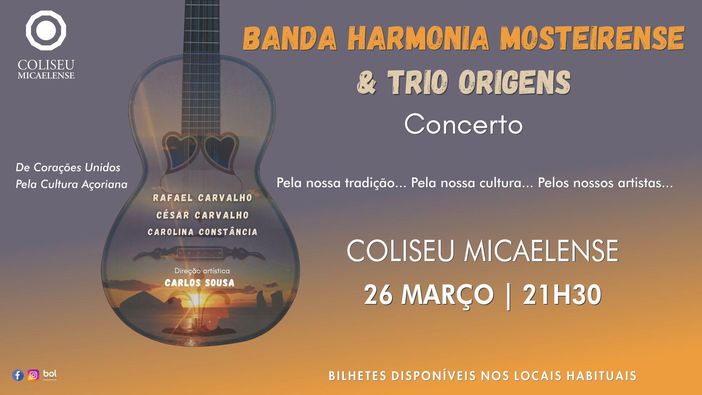 O Coliseu Micaelense e a Banda Harmonia Mosteirense apresentam o concerto com Rafael Carvalho, César Carvalho e Carolina Constância, com direção musical de Carlos Sousa - concerto "Banda Harmonia Mosteirense e Trio Origens". Um concerto que pretende enaltecer e homenagear a nossa Viola da Terra, preservando a nossa tradição, a nossa cultura e os nossos artistas.
