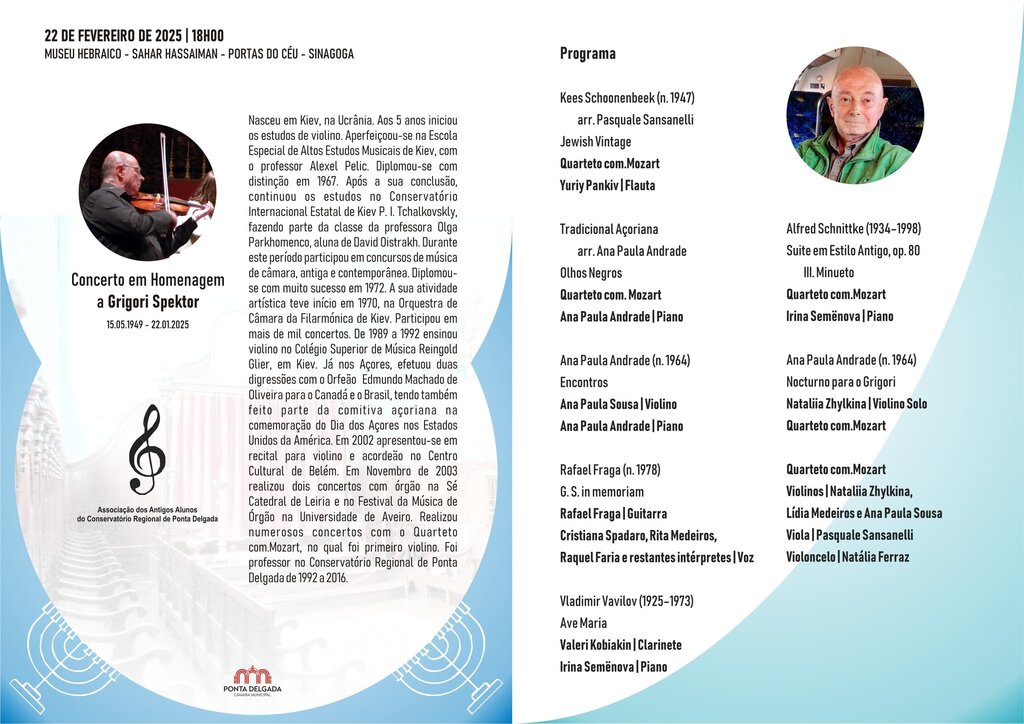 O Museu Hebraico - Sahar Hassaiman - Portas do Céu - Sinagoga, acolhe o concerto em homenagem a Grigori Spektor, pela Associação dos Antigos Alunos do Conservatório Regional de Ponta Delgada, onde lecionou violino, de 1992 a 2016.