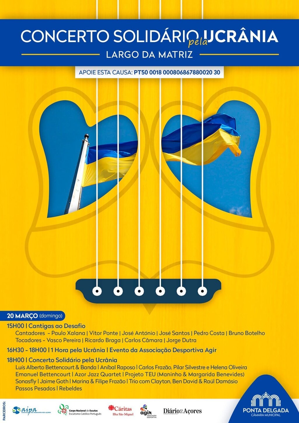 A Câmara Municipal de Ponta Delgada promove, no Largo da Matriz, o Concerto Solidário pela Ucrânia, com a atuação de vários artistas locais.