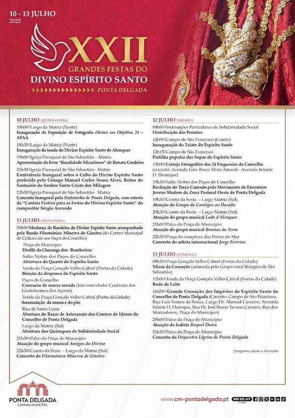 Datas10 a 13 Jul '25XXII Grandes Festas do Divino Espírito Santo