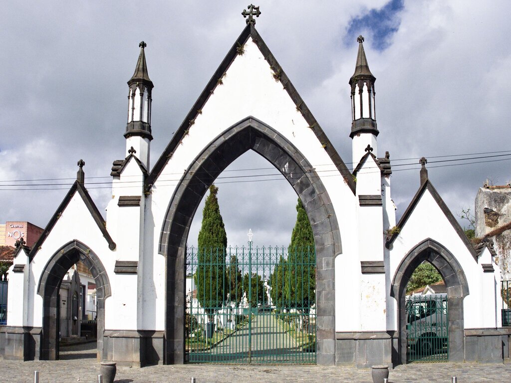 Características: Pórtico de três arcos, neogótico, com gradeamento em ferro, casa da guarda e moradia. Com alamedas, ladeadas por árvores, conta com Igreja no mesmo estilo ao centro e um pertinente conjunto de túmulos em mármore, alguns dos quais em homenagem aos representados. O edifício e pórtico é construído em alvenaria de pedra rebocada e caiada, excepto o soco, os cunhais, a cornija e as molduras dos vãos.