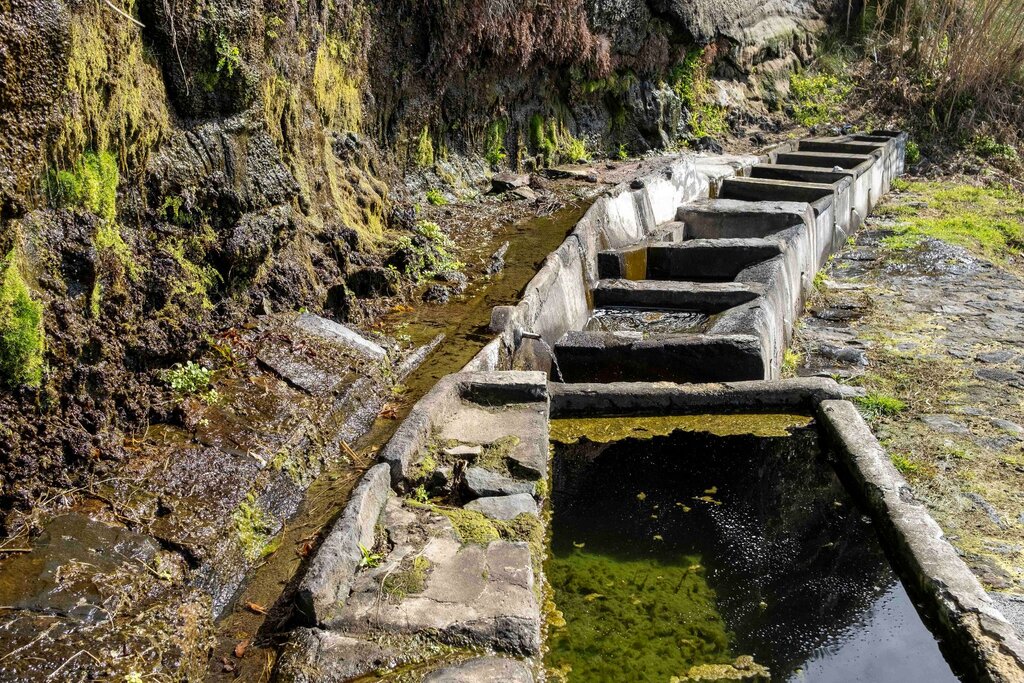Características: conjunto constituído por levada, para transporte de água, e pias de pedra esculpidas a partir de blocos de basalto. Trabalho artesanal em cantaria aparelhada a pico fino, com o objetivo de facilitar às lavadeiras, a lavagem da roupa.